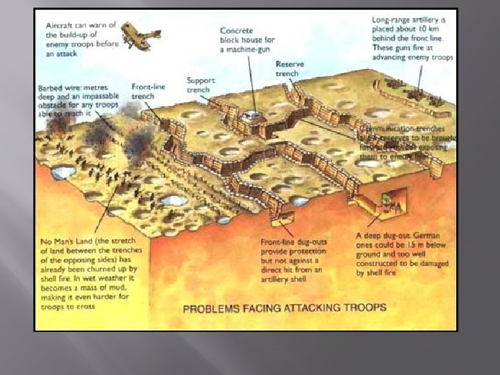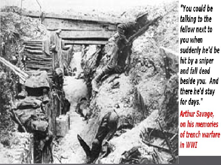 “If ever there is a true hell on earth, it is here in the trenches. ” -WWI Soldier • Most of WWI was a stalemate • Soldiers dug trenches to hold their positions • Often had to stand in water and mud for days • Trench foot • Rats