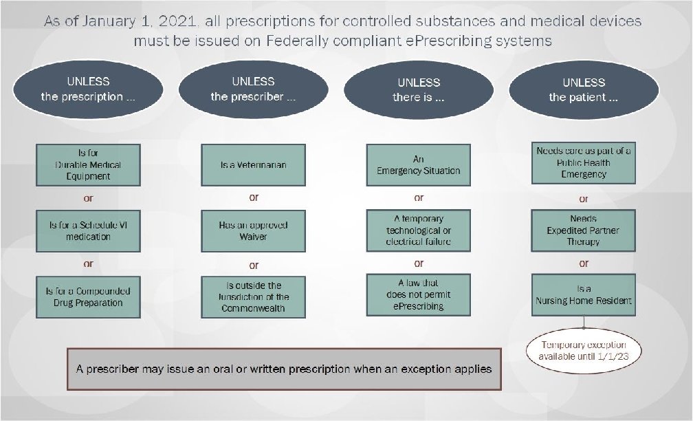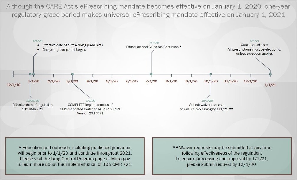 Summary of Regulatory Changes made based upon a review of all public comments and other states’ experience implementing required e. Prescribing: • Extend a grace period on implementation of mandated e. Prescribing until January 1, 2021; • Allow dispensing of Schedule VI Failovers as valid oral prescriptions • Provide exceptions from e. Prescribing requirements, including: – – – Emergency Situations; Time-limited waivers; ALL Schedule VI prescriptions; Prescriptions for residents of nursing homes through January 1, 2023; and Public health emergency response. • Clarify pharmacists’ role in filling prescriptions submitted under an exception or waiver. Massachusetts Department of Public Health mass. gov/dph