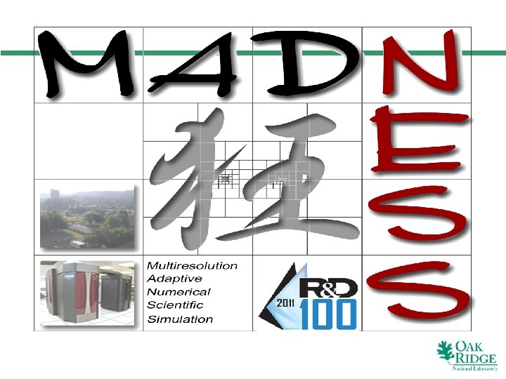 MADNESS for Sci. DAC UNEDF G. Fann 1, J. Pei 2, W. Nazarewicz 2, 1 and R. Harrison 1, 2 Oak Ridge National Laboratory 1 and Univ. of Tennessee 2 Objectives: Scalable and Portable Simulation Tools § Portable and scalable 3 -D adaptive pseudo-spectral methods for solving Schrodinger, Density Functional Theory and scattering equations in nuclear physics to arbitrary but finite accuracy—linear scaling DFT § Accurate and scalable solutions to non-symmetric, deformed potentials for nuclear DFT in 3 -D § Scalable to beyond 20 K wave functions w/ 100 K cores § Accurate solver for HFB equations, Skyrme functionals and fission simulations Example of a quasi-particle wavefunction Impact § Provide research community with a scalable 3 -D adaptive pseudo-spectral method for nuclear structure simulations, easy to program § Each wave-function or quasi-particle wave-function and operators have its own adaptive structure for accurate representation and computation § Solve DFT problems that are difficult for spline or deformed bases § Easy to Use – MATLAB style C++ § Currently no other known adaptive 2 -D nor 3 -D package in use in computational nuclear physics