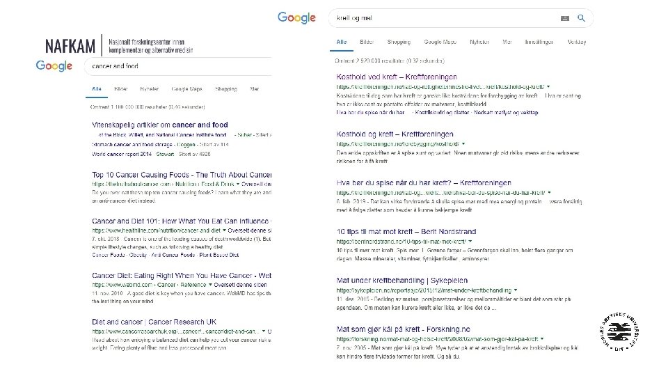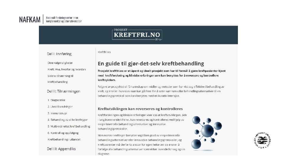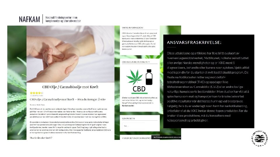 Hva er NAFKAM? • Nasjonalt Forskningssenter innen Komplementær og Alternativ Medisin • • • Et senter ved Ui. T/ Helsefak/ Institutt for Samfunnsmedisin Initiativ fra Norges Forskningsråd, Etablert av Helse- og Omsorgsdepartementet, og Finansieres av Helsedirektoratet over statsbudsjettet. WHO Collaboration Center for Traditional & Complementary Medicine NAFKAM. no Facebook – Twitter - Instagram