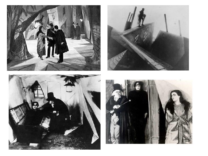 German Expressionism • A film premiered in Berlin, late February, 1920. • Das Kabinett des Dr. Caligari by Robert Wiene • Stylized sets with distorted buildings on canvas backdrops, crooked trees and lampposts, interiors in a theatrical manner. • Completely non-realistic performance - jerky and dance-like movements