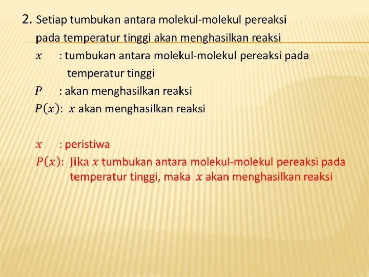 CONTOH: 1. 2. 3. Jika skor akhirmu kurang dari 40, maka kamu mendapatkan nilai D. Jika bilangan real dan , maka rasional. Sebuah balok 6 kg diam di puncak bidang miring kasar yang memiliki sudut kemiringan terhadap arah horizontal. Jika balok dibiarkan bebas, maka balok akan meluncur menuruni bidang dan dalam waktu 2, 5 detik menempuh jarak 4 m.