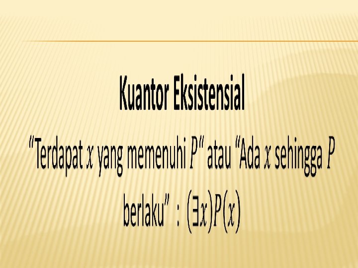 CONTOH KUANTOR EKSISTENSIAL = “penduduk kota Yogyakarta” = “penduduk kota Jakarta” = “mempunyai rumah lebih dari satu” = “Terdapat penduduk kota Yogyakarta yang mempunyai rumah lebih dari satu” = “Terdapat penduduk kota Jakarta yang mempunyai rumah lebih dari