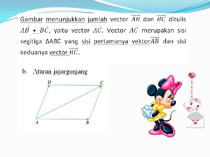 Gambar menunjukkan jumlah vektor dan ditulis , yaitu vektor. Vektor adalah diagonal jajargenjang ABCD yang sisi-sisi berdekatannya vektor dan. Pehatikan ; jika vektor = vektor , maka …. (1) Pehatikan ; jika vektor = vektor , maka …. (2) Jadi, .