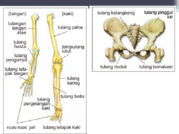 3) Gelang panggul, terdiri dari 2 tulang pinggul kanan dan kiri, 2 tulang duduk dan 2 tulang kemaluan. Gelang panggul sangat stabil karena berfungsi sebagai penahan berat tubuh. Gelang panggul berhubungan dengan alat gerak bagian bawah. 4) Alat gerak bagian bawah, tersusun atas 60 tulang yaitu 2 tulang paha, 2 tulang tempurung kaki, 2 tulang kering, 2 tulang betis, 14 tulang pergelangan kaki, 10 tulang telapak kaki, dan 28 tulang jari kaki.