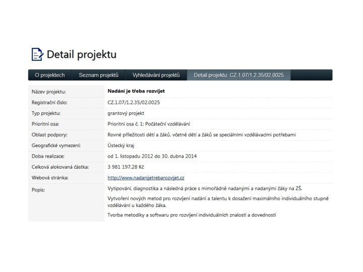 Matematické projekty – alternativa k PL • Objevitelský přístup • Rozvíjí kognitivní schopnosti v dané oblasti nadání • Modifikovatelný podle věku • Dlouhodobější využití při postupném rozvoji kognitivních schopností • Má diagnostický potenciál