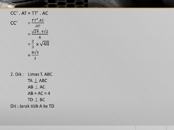 MATEMATIKA Adriansyah Putra P X IIS 1 2 Slides: 10 Download presentation MATEMATIKA Adriansyah Putra P. X IIS 1 / 2 § § T 6 c’ 6 4 A 4 B § T D C A y D C T A’ A D § § 6 6 D H G 1 E F 2 2 D A B C P H D B H G Q 3 D 3 1 Q § 5. Dik = balok ABCD. EFGH AB=12 Dit BC=3 BF=4 =jarak titik B dengan garis AG Jawab G G B’ B A 12 5 5 B B 13 4 C § 6. Dik= Limas T. ABC § panjang rusuk= 4 cm P adalah titik tengah AB Dit= jarak titik T T Jawab= 4 4 A C P C B 4 A 4 P B 2 P’ C 7. Dik= Kubus ABCD. EFGH § rusuk= 10 cm O Dit= jarak titik l ke bidang AFGD H G F E O P P D C L A 10 Jawab L’ B 10 L