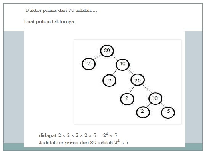 OPERASI HITUNG ALJABAR (6) 6. � � � Menentukan KPK dan FPB Bentuk Aljabar Kelipatan Persekutuan ter. Kecil Faktor Persekutuan ter. Besar Untuk mencari KPK dan FPB diperlukan: Ø Bilangan prima bilangan asli yang hanya mempunyai dua faktor yaitu bilangan itu sendiri dan 1, yaitu {2, 3, 5, 7, 11, . . . }. Ø Faktorisasi prima Menguraikan bilangan menjadi perkalian faktor prima. Untuk melakukan faktorisasi prima ini diperlukan pohon faktor.