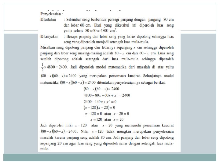 2. Irwansyah mempunyai selembar seng dengan panjang 80 cm dan lebar 60 cm. Ia ingin mengecilkan seng tersebut dengan memotong panjang dan lebarnya sama besar sehingga luas seng yang diperoleh menjadi setengah luas mula. Berapa panjang dan lebar seng yang harus dipotong?
