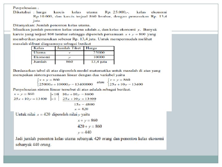 3. Dalam suatu pertandingan harga karcis pada kelas utama dijual Rp 25. 000. - per orang, sedangkan kelas ekonomi Rp. 10. 000, -. Jika banyak karcis yang terjual 860 lembar, dengan pemasukan Rp. 13, 4 juta, tentukanlah jumlah penonton kelas utama.