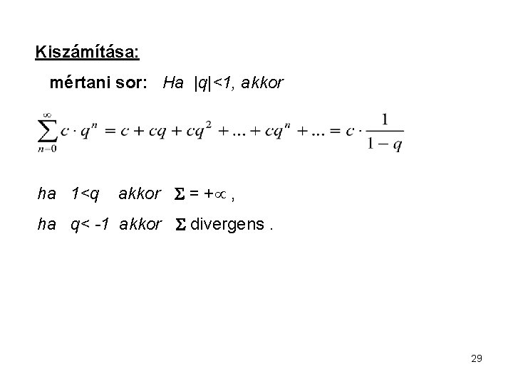 !!! Sor ≠ sorozat !!! 3. Sorok Probléma: = a 0+a 1+a 2+…+an+… = ? (végtelen sok tag) (matematikus) Megoldás: Definíció: (részletösszegekkel) : = lim (a 0+a 1+a 2+…+a. N) = lim (s. N) ha ez a határérték létezik. � 28