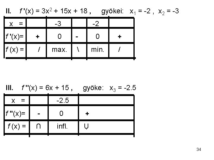 II. f '(x) = 3 x 2 + 15 x + 18 , x = -3 gyökei: x 1 = -2 , x 2 = -3 -2 f '(x)= + 0 - 0 + f (x) = / max. min. / III. f ''(x) = 6 x + 15 , x = gyöke: x 3 = -2. 5 f ''(x)= - 0 + f (x) = ∩ infl. Ụ 34