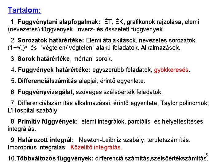 Tartalom: 1. Függvénytani alapfogalmak: ÉT, ÉK, grafikonok rajzolása, elemi (nevezetes) függvények. Inverz- és összetett függvények. 2. Sorozatok határértéke: Elemi átalakítások, nevezetes sorozatok. (1+s/n)n és "végtelen/ végtelen" alakú feladatok. Alkalmazások. 3. Sorok határértéke, mértani sorok. 4. Függvények határértéke: egyszerűbb feladatok, gyökkeresés. 5. Differenciálszámítás alapjai, érintő egyenlete. 6. Függvényvizsgálat, szöveges szélsőérték feladatok. 7. Differenciálszámítás alkalmazásai: érintő egyenlete, Taylor polinomok, L'Hospital szabály 8. Primitív függvények: elemi integrálok, parciális- és helyettesítéses integrálás. 9. Határozott integrál: Newton-Leibniz szabály, területszámítás. Improprius integrálás. Közelítő integrálás. 5 10. Többváltozós függvények: differenciálszámítás, szélsőértékszámítás.