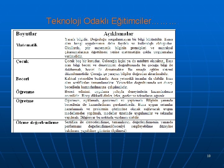 Teknoloji Odaklı Eğitimciler……… n n n Ölçme Değerlendirme Yaklaşımları Teknoloji odaklı bakış açısı hiyerarşik ve otoriterdir. Düzeyleri kontrol edip denetlemek hiyerarşideki her katmanın sorumluluğudur. Testler öğrencilerin matematik bilgisinin ve becerilerinin edinimi ve okul çalışmalarının zorunluluklarının yerine getirilmesi için gereklidir. Sonuç olarak, matematikte hatalar, kendi uygulamanızın başarısızlığı olarak hatta ahlak çürümesi olarak şiddetle eleştirilmektedir. n n Tartışma ve işbirliği reddedilmektedir. Çünkü bu çalışmalar kopya çekme arzusunu, sıkı çalışma olmaksızın cevapların bulunması ve tembellik içgüdüsünü destekleme riskine sahiptirler. Yarışma ahlaki olarak gereklidir, değerlerin başarı ve gelişim yoluyla ödüllendirilmesi gibi erdemlerin hayatta kalmasını sağlamaktadır. Açık ve basit hedefler gerekmektedir ve çocukların bilgi üretme ve bunları doğru bir şekilde kullanma becerileri test edilmelidir. Testleri doğru bir şekilde geçmek hedeflenen amaçtır. 9