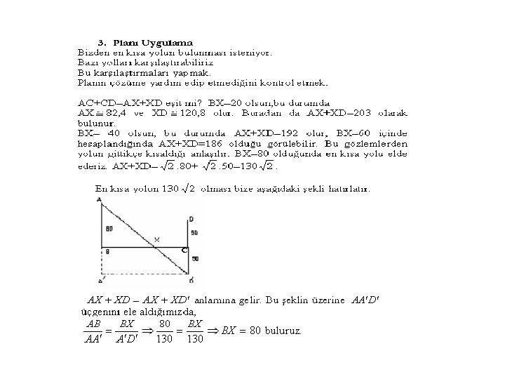 Problem Çözme Yoluyla Öğrenme……. • Problem: Gece karanlığında sahildeki bir kasabadan 80 mil kuzeyde bulunan çok kıymetli mücevherle yüklü gemiyi bir korsan gemisi kovalamaktadır. Kasabanın 130 mil doğusundaki noktadan 50 mil kuzeye doğru uzanan tehlikeli kayalıklardan oluşan bir burun vardır. Burunun ucunda gemileri karanlıkta bu tehlikeli kayalıklardan koruyan onlara yol gösteren bir deniz feneri bulunmaktadır. Mücevher gemisi kıymetli yükünü birkaç güvenilir tayfası ile birlikte kıyıya bırakıp en kısa yoldan fenere ulaşarak feneri söndürüp korsan gemisinin kayalara çarpmasını sağlamak istiyor. Bu senaryoya göre mücevher gemisi en kısa yolu izlemek için sahile hangi noktadan çıkmalı ve yükünü bırakmalıdır?