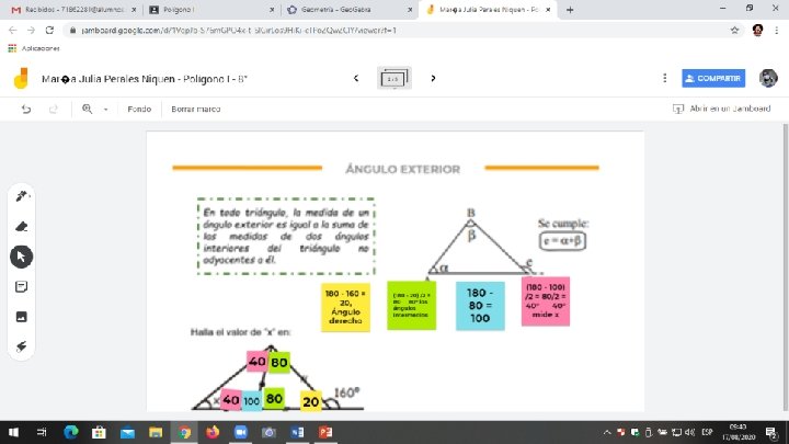 ÁNGULO EXTERIOR En todo triángulo, la medida de un ángulo exterior es igual a la suma de las medidas de dos ángulos interiores del triángulo no adyacentes a él. 180 – 160 = 20 20° ángulo derecho (180 – 20) /2 = 80 80° los ángulos intermedios Halla el valor de “x” en: 40° = x 100° 180 – 80 = 100° ángulo (180 – 100) /2 = 40 80° 20° 40° mide x