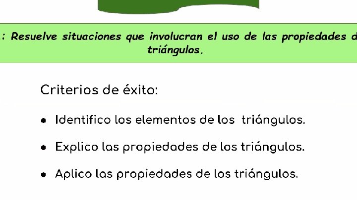 EVALUACIÓN DE CRITERIOS DE ÉXITO Llegó el momento de autoevaluarnos con nuestros criterios de éxito. META: Resuelve situacione s que involucran el uso de las propiedad es de los triángulos Criterios de éxito: ● Identifico los triángulos. elementos Necesito apoyo de los Lo entendí y puedo explicarlo Sí ● Explico las triángulos. propiedades de los Sí ● Aplico las triángulos. propiedades de los Sí