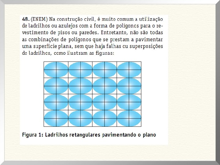 QUESTÃO 03 - QUESTÃO 140 prova cinza (2° dia) Um dos grandes problemas enfrentados nas rodovias brasileiras é o excesso de carga transportada pelos caminhões. Dimensionado para o tráfego dentro dos limites legais de carga, o piso das estradas se deteriora com o peso excessivo dos caminhões. Além disso, o excesso de carga interfere na capacidade de frenagem e no funcionamento da suspensão do veículo, causas frequentes de acidentes. Ciente dessa responsabilidade e com base na experiência adquirida com pesagens, um caminhoneiro sabe que seu caminhão pode carregar, no máximo, 1 500 telhas ou 1 200 tijolos. Considerando esse caminhão carregado com 900 telhas, quantos tijolos, no máximo, podem ser acrescentados à carga de modo a não ultrapassar a carga máxima do caminhão? A 300 tijolos B 360 tijolos C 400 tijolos D 480 tijolos E 600 tijolos
