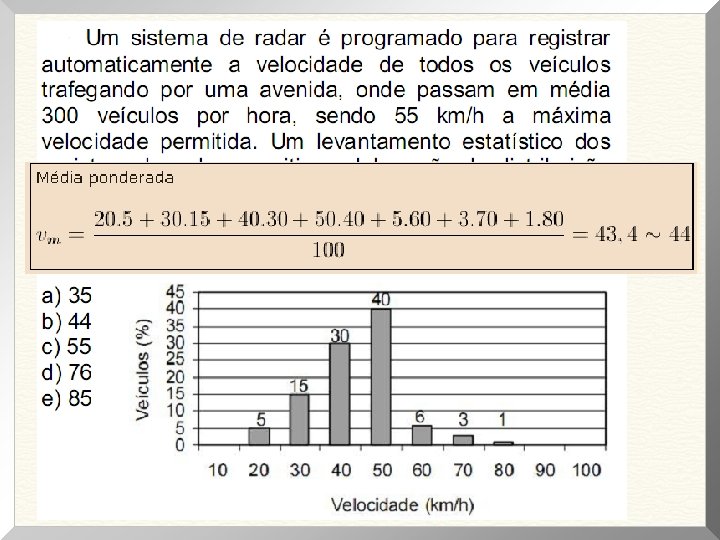 A questão trata de média ponderada, que para cada valor deve-se levar em conta o valor do seu peso. Aqui no caso número de veículos x velocidade. 20. 5 + 30 x 15 + 40 x 30 + 50 x 40 + 60 x 6 + 70 x 3 + 80 x 1 Vm = ----------------------- 100 Vm = 44 km/h