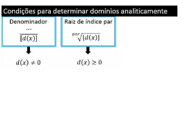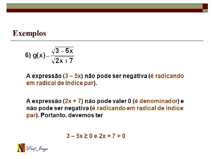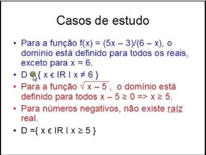 Matemática, 1º ano - Estudo das funções conceitos iniciais DOMÍNIO DE UMA FUNÇÃO REAL Determinar o domínio de uma função em IR, é determinar o subconjunto de IR, formados por todos os valores de x possíveis, para que as expressões resultem em um número real. Exemplos: Determine o domínio, em IR, das funções: a) b) 2 x – 6 ≥ 0 2 x ≥ 6 x≥ 3 2 x – 5 ≠ 0 2 x ≠ 5/2 D (f) = {x R/ x ≠ 5/2} D (f) = {x R/ x ≥ 3}