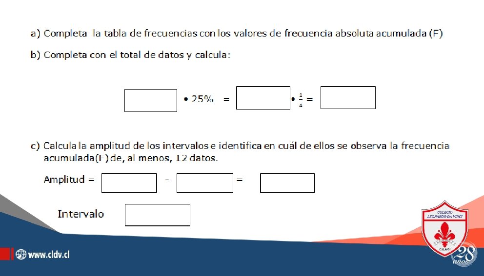 Ejercicio: (7 pts. c/u) Desarrollo • Analiza la siguiente situación. Luego, completa la tabla y calcula: Se realizó un estudio sobre la edad de los asistentes a un teatro. La siguiente tabla muestra los resultados obtenidos.