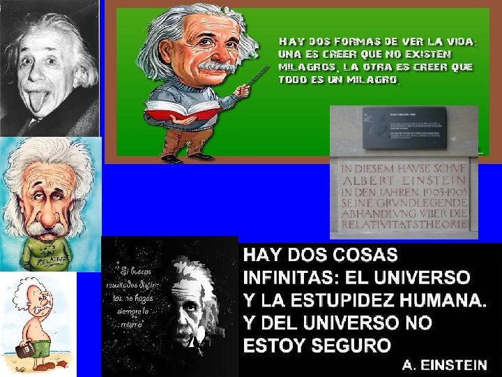 • Como no seguía las normas y hábitos de la primera escuela, le invitaron a abandonarla. • Decidió ingresar en la Politécnica de Zurich (Suiza) donde encontró un clima amable y libre para dedicarse a las matemáticas y a la física. • Le gustaba tocar el violín y asistir a la ópera. • Mientras tanto acabó sus estudios, se casó y tuvo dos hijos. Encontró trabajo en la oficina Suiza de patentes. • En 1905 publicó una primera versión de la teoría de la relatividad y llamó la atención de todo el mundo científico.