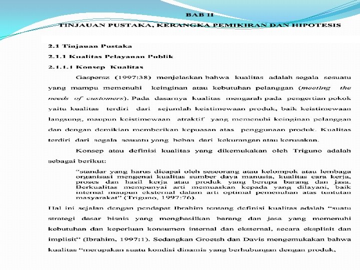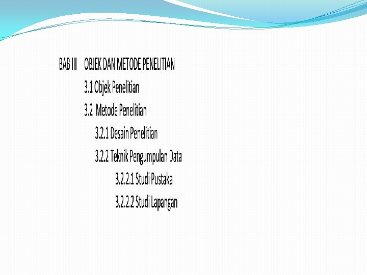 Menyusun instrumen Operasionalisasi Variabel � Variabel yang dipertanyakan dalam Rumusan Masalah dan dinyatakan dalam Hipotesis dioperasionalkan menjadi dimensidimenasi dan indikator-indikator yang ditampilkan dalam Matrik/Tabel Operasionalisasi Variabel � Mengoperasionalkan variabel menjadi dimensi-dimensi didasarkan pada konsep teoritis yang dikemukakan dalam Kerangka Pemikiran � Merinci dimensi menjadi indikator bisa didasarkan pada konsep teoritis yang relevan dan pada informasi empirik � Setiap indikator harus kongkrit dan terukur bukan berupa pernyataan yang bersifat deskriptif atau bersifat relatif � Fungsi utama Opersionalisasi Variabel untuk menjadi dasar penyusunan instrumen penelitian (Daftar Pertanyaan) Jumlah pertanyaan yang disusun berdasarkan jumlah indikator yang dirinci dalam Operasionalisasi Variabel
