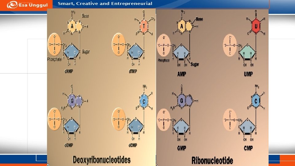 NUKLEOTIDA (OH) (ribose) § C 1 dari pentosa berikatan dengan Basa Nitrogen § C 5 dari pentosa berikatan dengan gugus fosfat § C 2 dari pentosa menjadi pembeda antara DNA & RNA § C 3 dari pentosa sebagai tempat pengikatan dengan nukleotida lain
