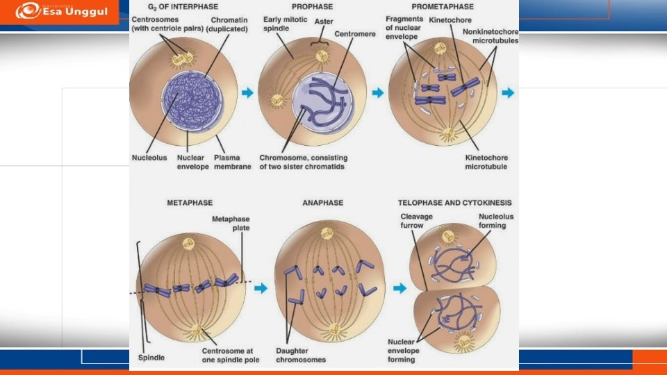 PEMBELAHAN MITOSIS q Mitosis merupakan pembelahan sel yang melalui tahap-tahap yang teratur yang terjadi pada sel somatik q Satu sel membelah menjadi dua yang sama persis q Setiap sel anak mengandung kromosom yang sama dengan induknya q Terdiri atas pembelahan inti dan sitoplasma q Terjadi dalam 4 fase : 1. Profase 2. Metafase 3. Anafase 4. Telofase