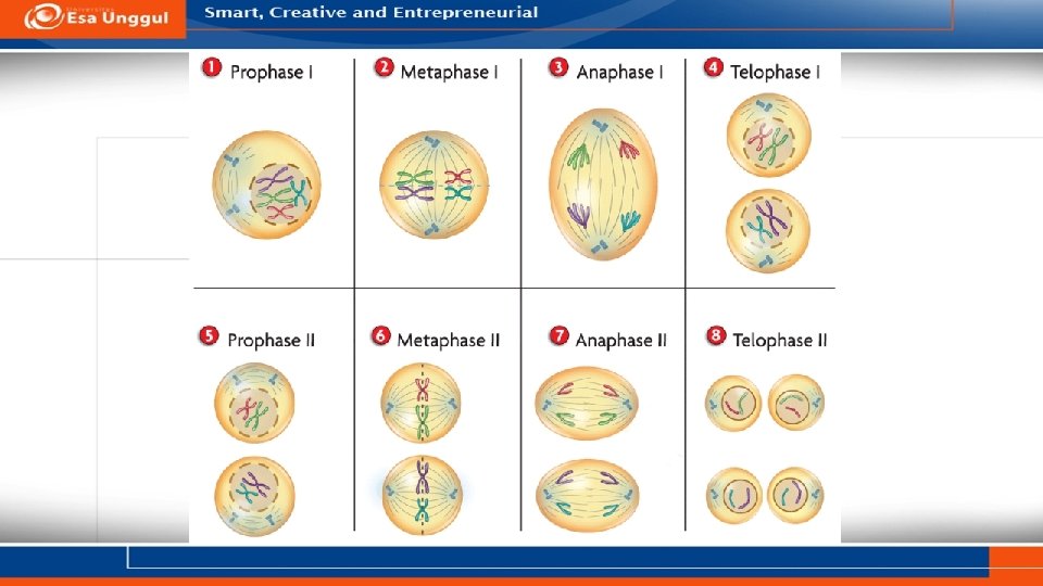 PEMBELAHAN MEIOSIS v Meiosis adalah proses menghasilkan gamet yang haploid dari diploid v Sel mengalami dua pembelahan berurutan, disebut meiosis I dan meiosis II. v Pembelahan Meiosis disebut juga pembelahan reduksi (terjadi pada meiosis I) v Dua pembelahan meiosis dilangsungkan oleh hanya satu proses duplikasi kromosom, sehingga hasilnya keempat sel anakan hanya memiliki separuh jumlah kromosom induknya.