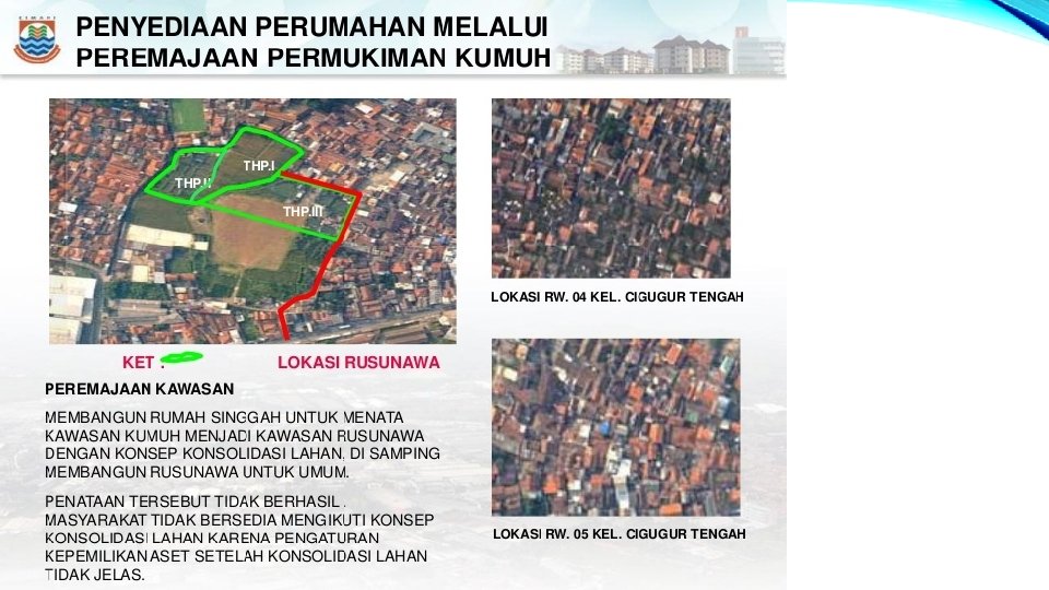 PEREMAJAAN KOTA • URBAN REDEVELOPMENT (PEREMAJAAN KOTA) Bersifat Parsial / Fisik • URBAN RENEWAL (PEMBAHARUAN KOTA) Bersifat menyeluruh / fisik / sosial – budaya - ekonomi
