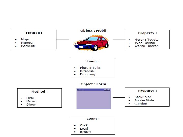 1. Mengenal Ms. Visual Basic 6. 0 • Visual BASIC (Beginners All-Purpose Symbolic Instruction Code merupakan sebuah bahasa pemrograman yang dapat digunakan untuk membuat suatu aplikasi dalam Microsoft Windows. • Visual BASIC menggunakan metode Graphical User Interface (GUI) dalam pembuatan program aplikasi (project). • Dalam Visual BASIC, pembuatan program aplikasi harus dikerjakan dalam sebuah project. Sebuah Project dapat terdiri dari File Project (. vbp), File Form (. frm), File data binary (. frx), Modul Class (. cls), Modul Standar (. bas), dan file resource tunggal (. res). Bahasa yang digunakan adalah bahasa BASIC yang sangat populer pada era sistem operasi DOS. • Visual Basic merupakan salah satu bahasa pemrograman yang mendukung pemrograman berorientasi objek (Object Oriented Programming/OOP) • Contoh penerapan pemrograman berorientasi objek dapat dilihat pada Gambar di bawah ini :