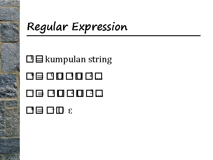 Regular Expression an a sebanyak n a* a sebanyak 0 sampai tak hingga a+ a sebanyak 1 sampai tak hingga 111 | 222 ada sebanyak 2 pilihan, 111 atau 222