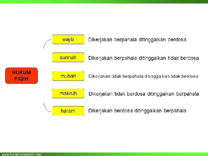 Al Ahkam Al Khamsah o o Ahkam jamak dari perkataan hukm Khamsah atinya lima Al Ahkam Al Khamsah yang disebut juga hukum taklifi Hukum yang menghendaki dilakukannya suatu pekerjaan oleh mukallaf, atau melarang mengerjakannya, atau melakukan pilihan antara melakukan dan meninggalkannya.