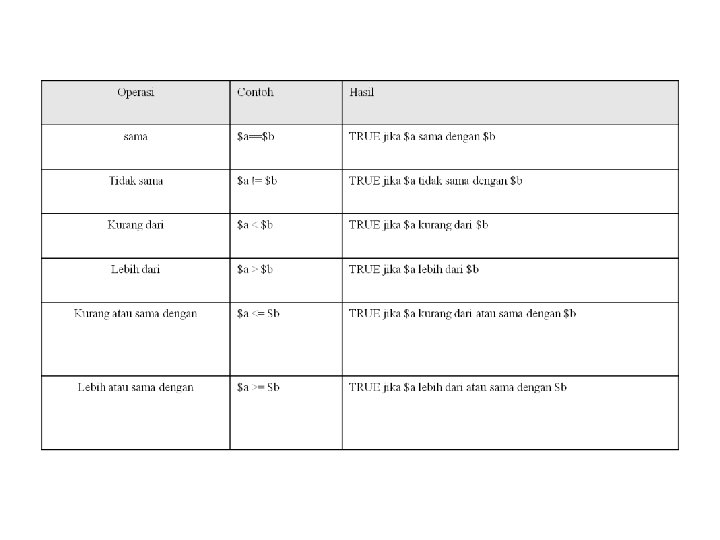 Operator Logika Yt : operator yg digunakan untuk membandingkan 2 nilai yng akan menghasilkan nilai true dan false. • Hasil operasi ini akan didapatkan nilai satu(1) jika bernilai benar atau nol(0) jika bernilai salah