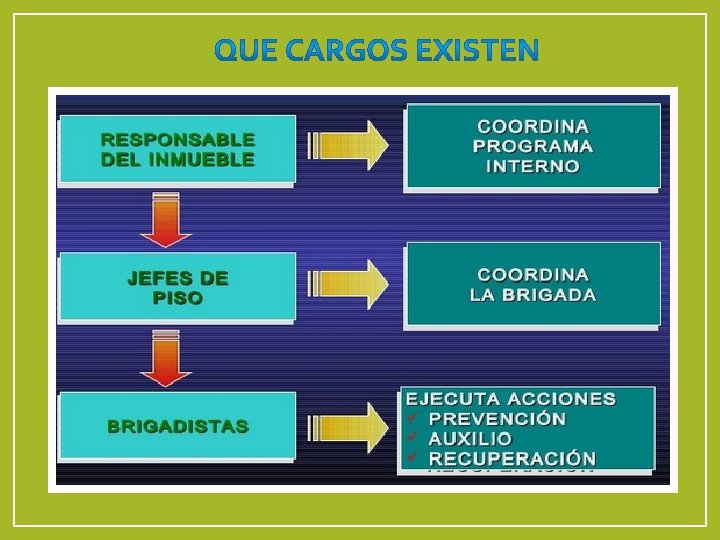 Coordinador titular En caso de siniestro, avisa inmediatamente a los coordinadores generales En caso de que el coordinador general no se encuentre en el área para iniciar las acciones de control se coordinara con algún jefe de piso. Se coordina con las otras brigadas durante el siniestro para brindarse apoyo mutuamente Se asegura de tener su directorio telefónico siempre actualizado Solicita ayuda externa en caso de ser necesario
