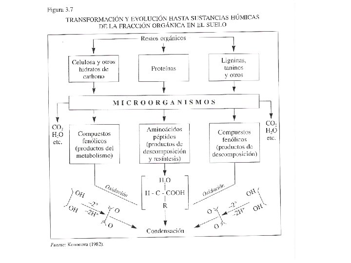 Comparación entre la composición de la MOS y de los RV %Peso Organismos Leguminosas herbáceas Raíces Hojas Ceras, Grasas, Resinas 10 -12 Proteínas Celulosa Hemicelulosa, carbohidratos Lignina y derivados C/N 10 -15 12 -20 20 -25 15 25 -30 10 -12 10 -15 5 12 -16 Gramíneas Perennes Raíces 5 -12 5 -10 25 -30 15 -20 Árboles caducifolios Hojas Maderas 3 -5 - 4 -10 0. 5 -1 15 -25 40 -50 10 -20 20 -30 10 20 -25 40 -50 - Coníferas Hojas Maderas 20 -25 - 5 -7 0. 1 -1 20 45 -50 15 -25 15 25 -30 60 -70 - Bacterias - 40 -70 - Mucosidad - 8 -12 Musgos - 5 -10 15 -25 30 -60 no - Algas - 10 -15 5 -10 50 -60 - - MOS 0. 8 -7. 7 30 -35 3 -5 5 -12 30 -50 8 -15