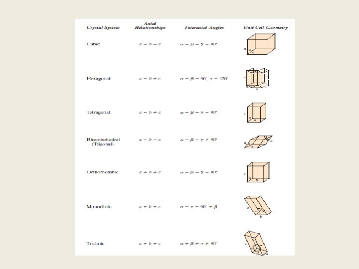 Sistemas cristalinos Em função da grande quantidade estruturas cristalinas possíveis, é conveniente subdividi-las em grupos de acordo com as configurações da célula unitária ou arranjo atômico. Tal esquema é baseado na geometria da célula unitária, isto é, na forma apropriada do paralelepípedo da célula unitária, sem considerar as posições atômicas na célula. Um sistema de coordenado x, y e z é estabelecido com sua origem em um dos vértices da célula unitária.