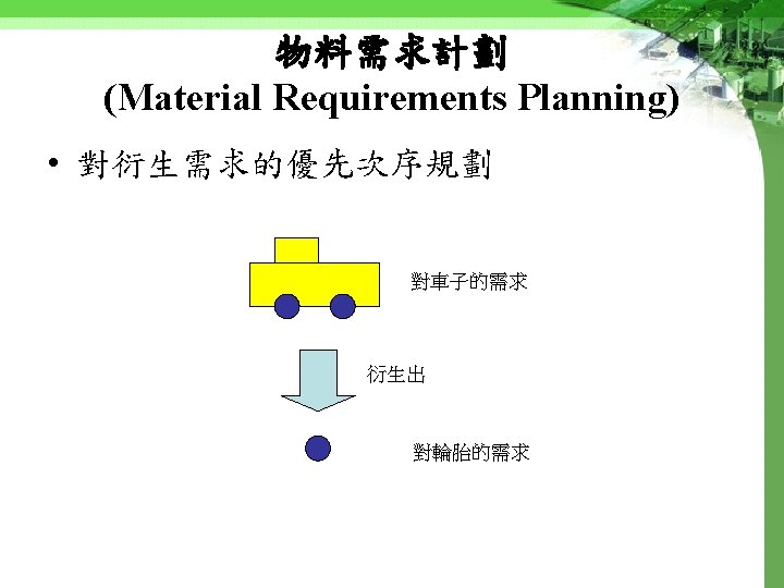 物料需求計劃 (Material Requirements Planning) • MRP Process Exploding and Offsetting Gross and Net Requirements Releasing Orders