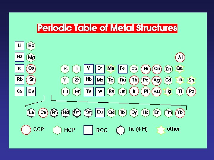 Principales Estructuras Cristalinas Metálicas La mayoría de los metales puros (aprox. 90%) cristalizan al solidificar en tres estructuras cristalinas compactas: Cúbica Centrada en el cuerpo (BBC) Cúbica Centrada en las caras (FCC) y Hexagonal Compacta (HCP) Los sólidos se empacan en estructuras compactas porque la energía es menor a medida que disminuye la distancia entre los átomos o iones.