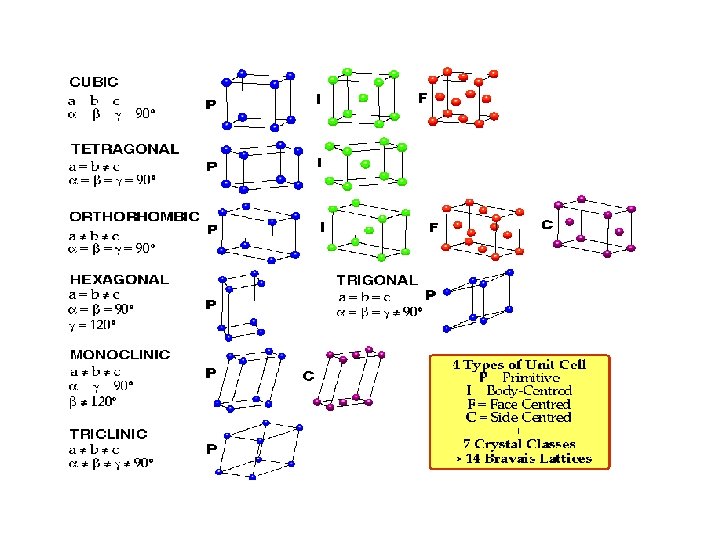 Con distintas longtidudes axiales y ángulos interaxiales se pueden construir celdas unitarias de diversos tipos. Los cristalógrafos han demostrado que se necesitan siete tipos diferentes de celdas unitarias para crear todas las redes. Varios de los siete sistemas cristalinos presentan variaciones de su estructura básica, totalizando 14 celdas unitarias según la demostración de Bravais