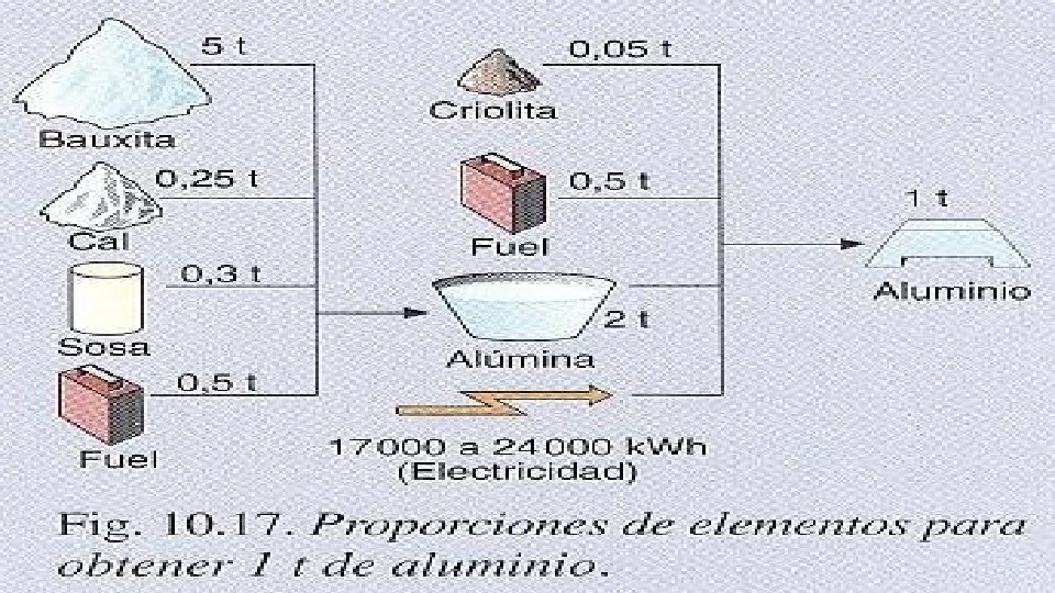 Afino electrolítico La alumínia se mezcla con criolita y se somete a un proceso electrolítico que separa el aluminio del oxígeno. El oxígeno forma monóxido y dióxido de carbono y se desprende. El aluminio puro va depositándose en el fondo de la cuba fundido de la que se extrae mediante una cuchara. Para obtener una tonelada de aluminio se requieren entre 17000 y 24000 k. Wh.