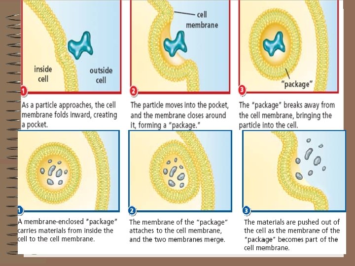 TRANSPORT REQUIRING ENERGY, CONTINUED • ENDOCYTOSIS: large bits of material get captured in pocket of membrane • Pocket breaks off and forms package that moves into cell. • Cells use this to fight bacteria & viruses by absorbing them. • EXOCYTOSIS: a membrane within the cell encloses material needed to be removed • Package moves to cell membrane, joins with it, and expels material • Cells use this to flush out waste or expel proteins & hormones made by the cell.