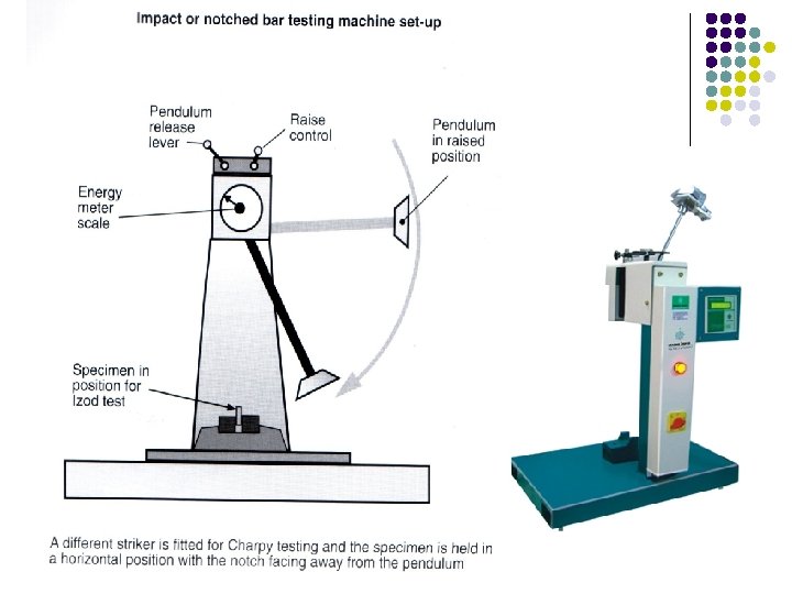 Izod test l Strikes at 167 Joules. l Test specimen is held vertically. l Notch faces striker.