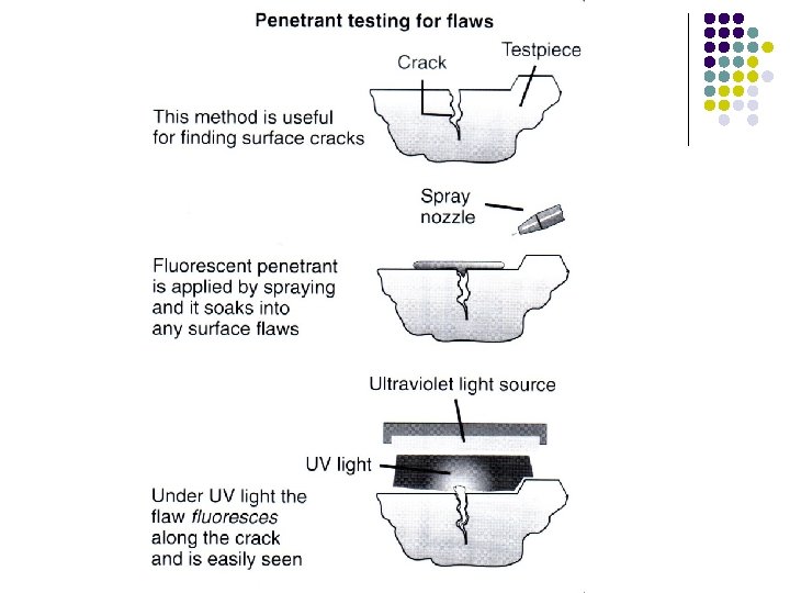Penetrant testing l l Used for surface flaws. The oil and chalk test is a traditional version of this type of testing. Coloured dyes are now used.