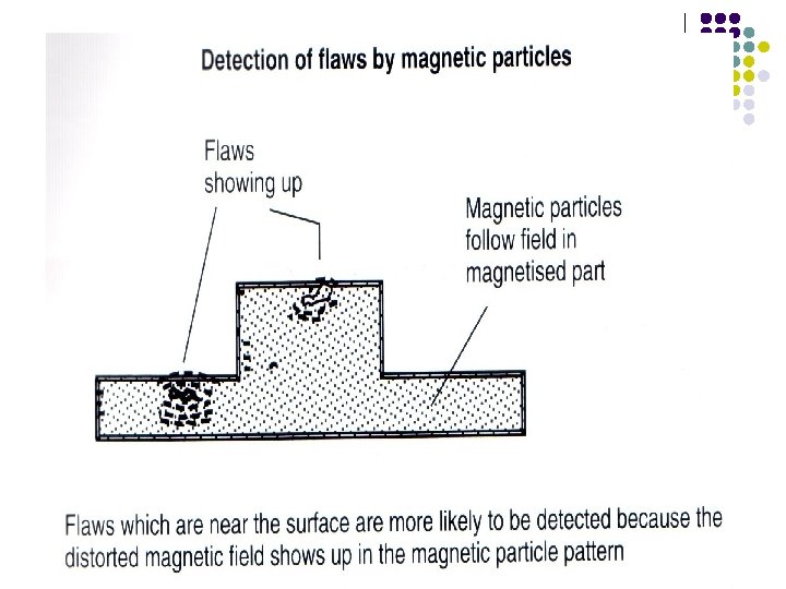 Magnetic particle testing • • • Used for ferrous metals. Detects flaws close to the surface of the material. The component to be tested must first be magnetized. Magnetic particles which can be dry or in solution are sprinkled onto the test piece. The particles stick to the magnetic field and flaws can be inspected visually by examining the pattern to see if it has been distorted. The component must be demagnetized after testing.