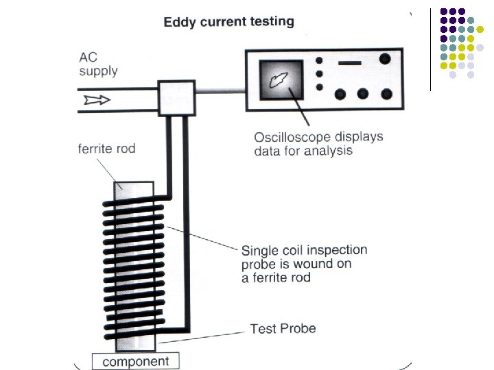Eddy current testing l l Used for non-ferrous metals A. C. current is passed through the coil. The test piece is passed under the coil causing secondary currents called eddy currents to flow through the test piece. This causes a magnetic field to flow in the test piece. The flaws are detected on an oscilloscope by measuring a change in the magnetic field.