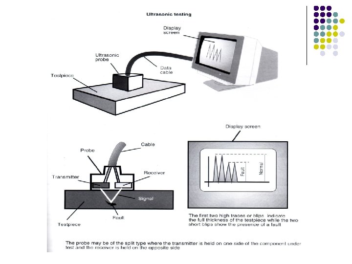 Ultrasonic testing Ultrasonic Sound waves are bounced off the component and back to a receiver. If there is a change in the time taken for the wave to return this will show a flaw. This is similar to the operation of a sonar on a ship. Operation. 1. The ultrasonic probe sends the sound wave through the piece. 2. The sound wave bounces off the piece and returns. 3. The results are then placed on the display screen in the form of peaks. 4. Where the peaks fluctuate this will show a fault in the piece. Uses. l This is generally used to find internal flaws in large forgings, castings and in weld inspections.