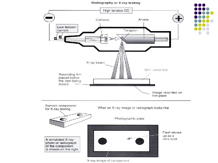 Radiography (X-ray) Testing The x-ray are released by heating the cathode. 2. They are then accelerated by the D. C. current and directed onto the piece by the tungsten anode. 3. The x-rays then pass through the test piece onto an x-ray film which displays the results. 4. The x-rays cannot pass through the faults as easily making them visible on the x-ray film. Uses. l This is a test generally used to find internal flaws in materials. It is used to check the quality of welds, for example, to find voids or cracks. 1.