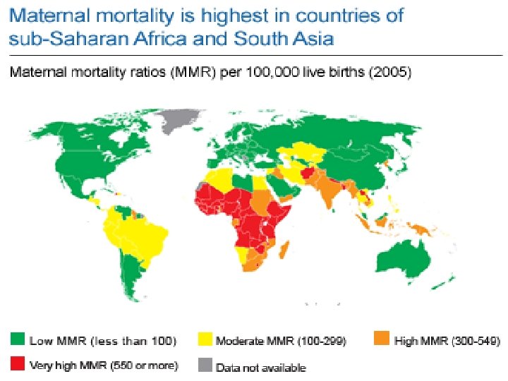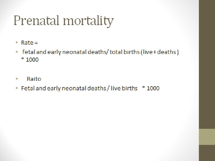Maternal mortality • Rate: • Number of maternal deaths in given period per 100 000 women of reproductive age during the same time period • • • Ratio: Ratio number of maternal deaths during a given time period per 100 000 live births during the same time period